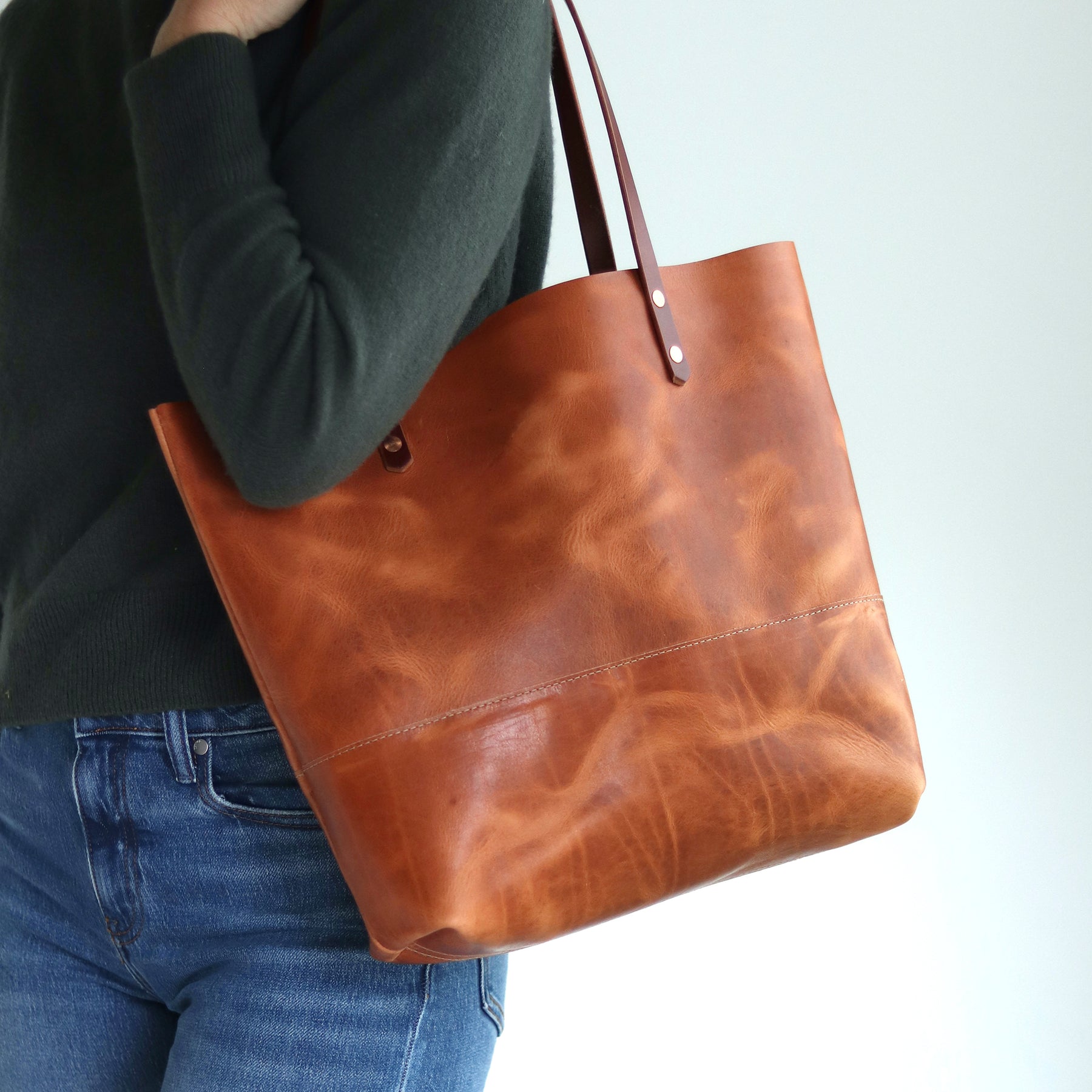 Artisan-made Horween leather tote with full-grain texture and unique patina.